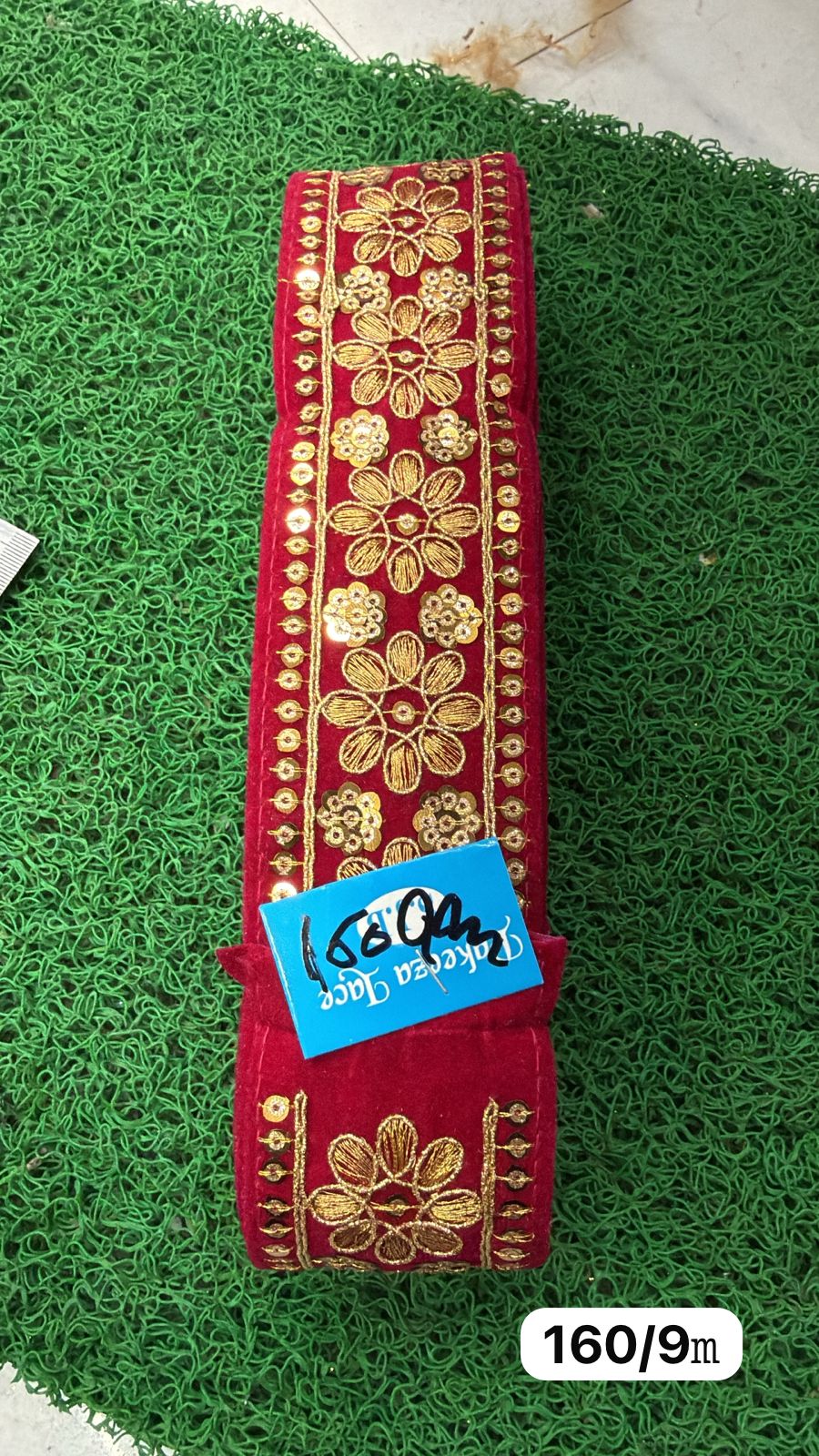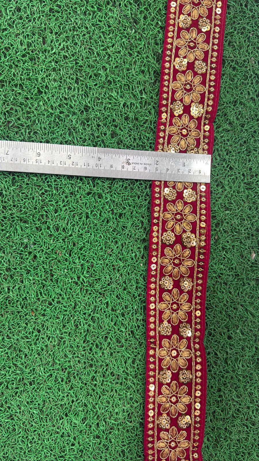 Sardar Ji Lace Wale presents a premium red embroidery lace featuring elegant golden floral patterns with detailed sequin work and side border detailing. The rich color and intricate design give a classy and festive look, perfect for ethnic and designer outfits.